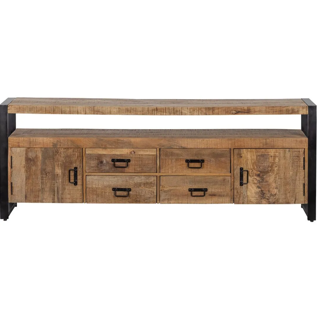 Het Britt-televisiemeubel heeft een zeer ruimtelijke uitstraling die meteen opvalt in de ruimte. Het meubel is gemaakt van warm mangohout met zwartmetalen accenten, waardoor dit industriële meubel in iedere ruimte past. Het meubel heeft dankzij de lades en de ruimte achter de deurtjes voldoende opbergruimte voor allerlei accessoires. De tussenruimte kan gebruikt worden om apparatuur of bijvoorbeeld tijdschriften te plaatsen.