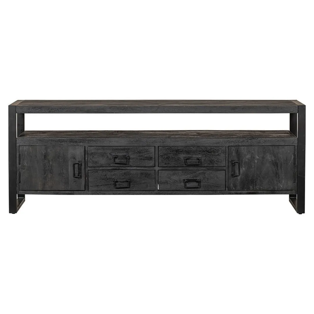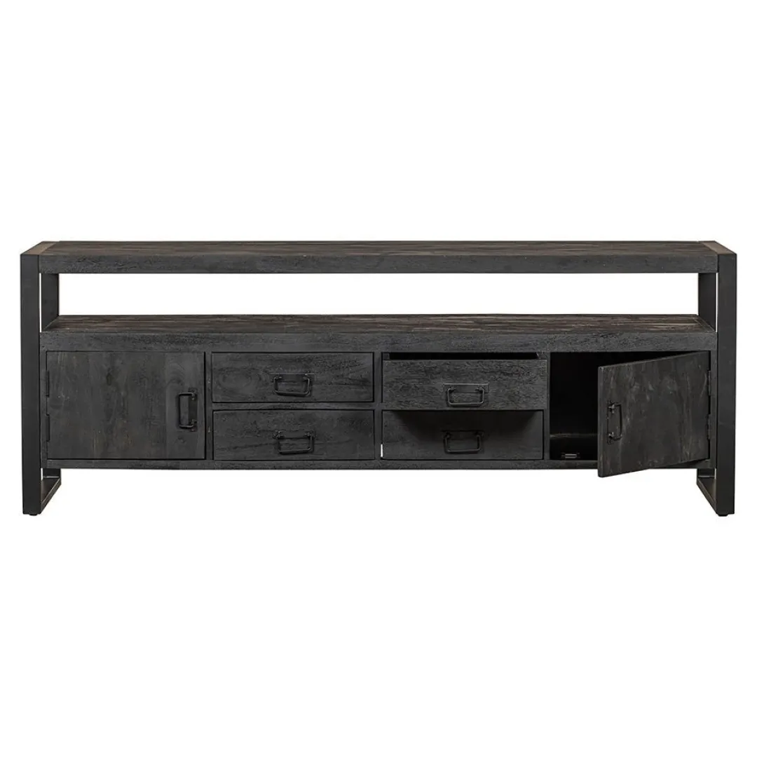 Het mangohout is massief en is eerst gezandstraald, waarna het behandeld wordt met zwarte verfbeits en tenslotte wordt afgewerkt met een donkere, natuurlijke bijenwas om het hout te beschermen tegen vocht, vuiligheid en kringen. De frames en de handgrepen zijn gemaakt van zwart gepoedercoat metaal.
