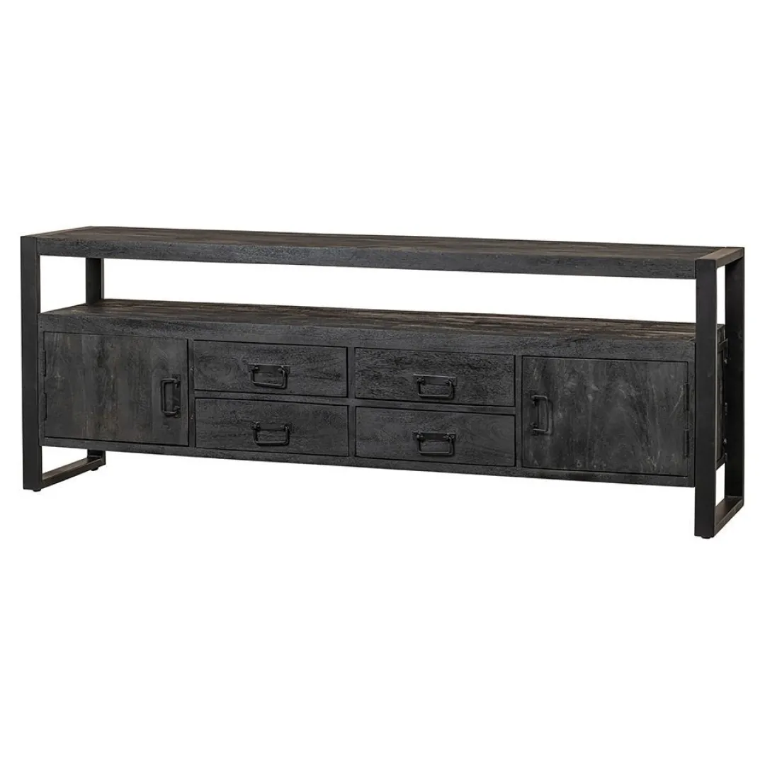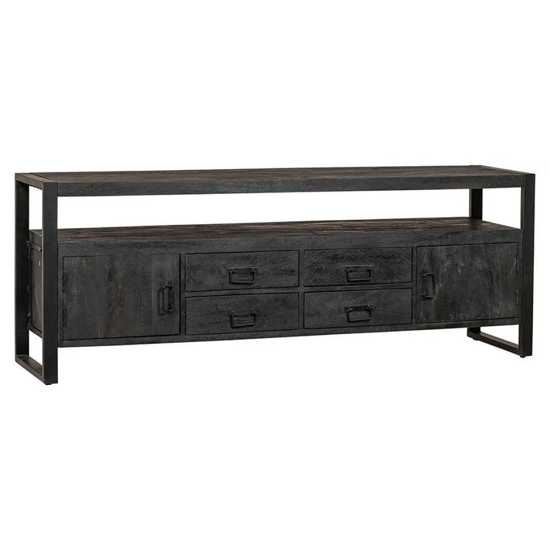 Het Britt Black-televisiemeubel is een groot en ruim televisiemeubel dat er ook nog eens fantastisch uitziet! De kast heeft een stijlvol uiterlijk door het unieke zwarte mangohout met de zwartmetalen accenten. Dit zal een perfect geheel vormen met de televisie! De kast beschikt over twee ruime vakken achter de deurtjes. In het midden bevinden zich vier lades waarin ook allerlei spullen kunnen worden opgeborgen. Het open vak kan benut worden om apparatuur te plaatsen zoals een tv-ontvanger of een geluidsbox, waarvan de kabels eenvoudig aan de achterkant kunnen worden weggewerkt.