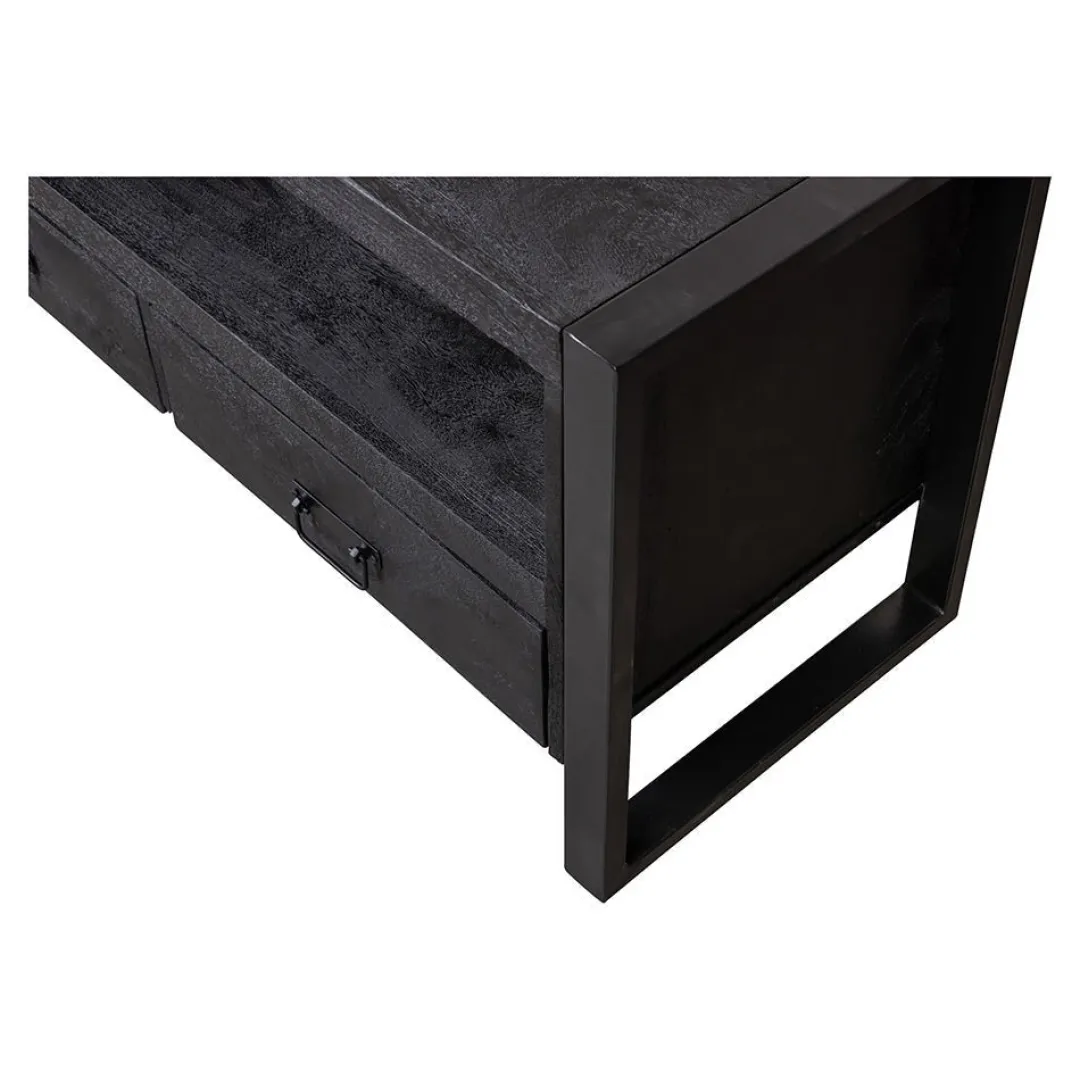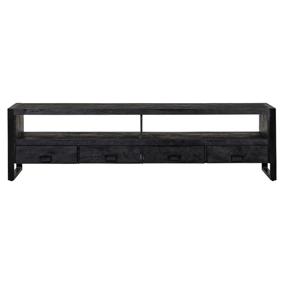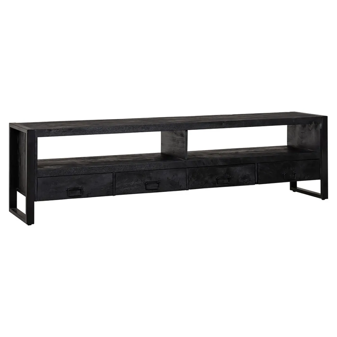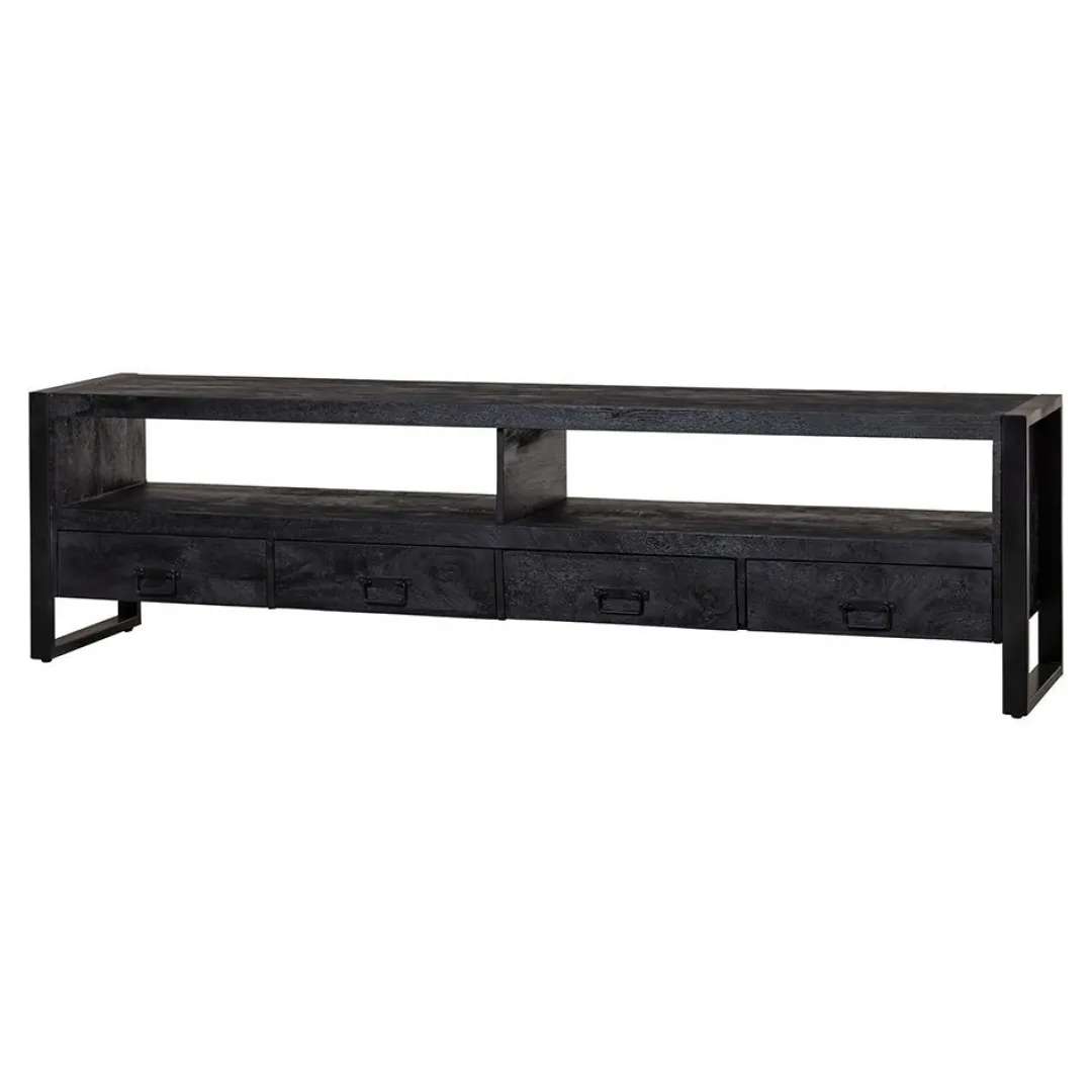 De grootste variant van de Britt Black-collectie! Het meubel vormt dankzij het zwarte mangohout en de zwartmetalen elementen een strak geheel dat de toon zet in huis! Het meubel is ideaal om een grote televisie op te zetten en verder beschikt het meubel over een ruim open vak met daaronder vier lades om accessoires een plek te geven.