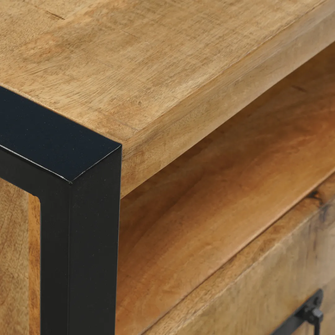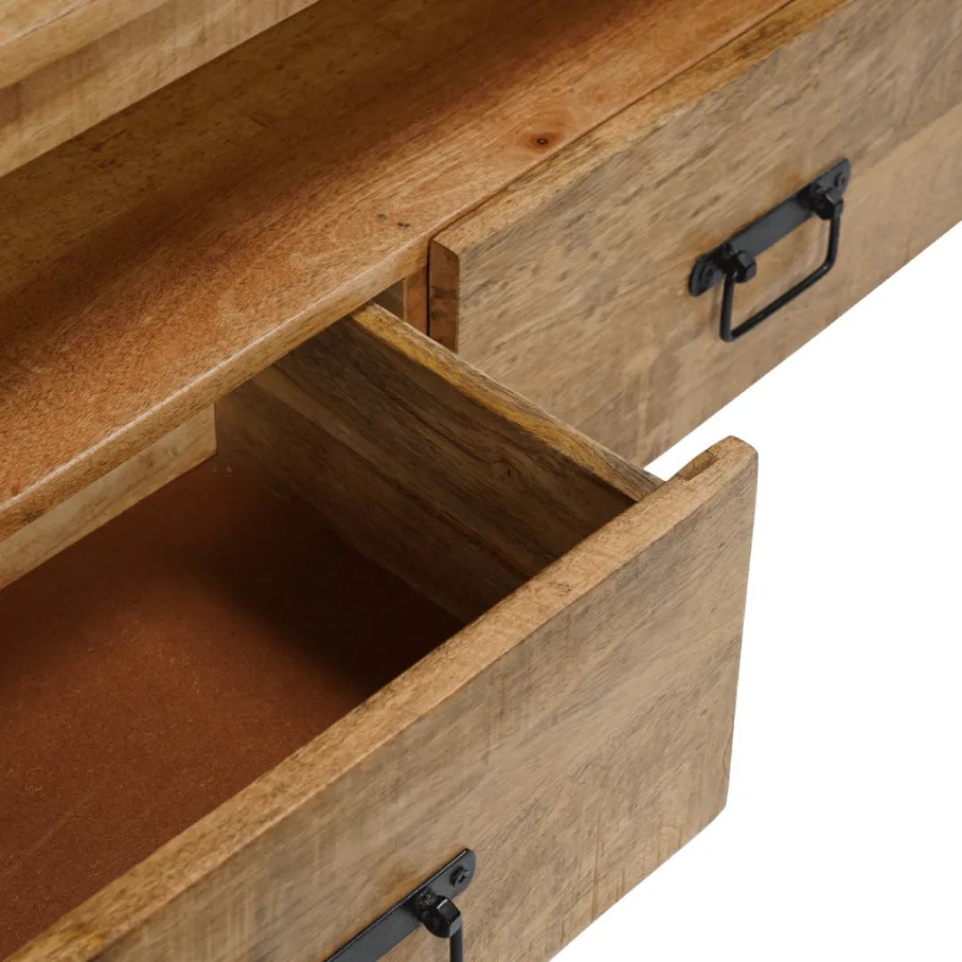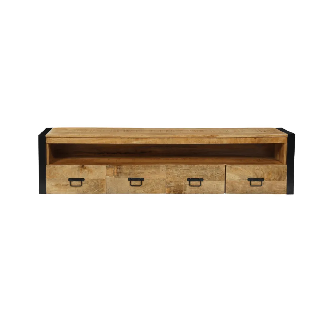 Het zwevende tv-meubel Britt is dé blikvanger voor een modern of industrieel interieur. Gemaakt van massief mangohout in combinatie met zwart metalen accenten, straalt dit meubel karakter en robuustheid uit. De drie ruime lades bieden handige opbergruimte voor afstandsbedieningen, kabels of accessoires, terwijl het open vak perfect is voor je mediabox of spelcomputer. Dankzij het zwevende ontwerp houd je eenvoudig je vloer schoon én oogt je woonkamer ruimer.