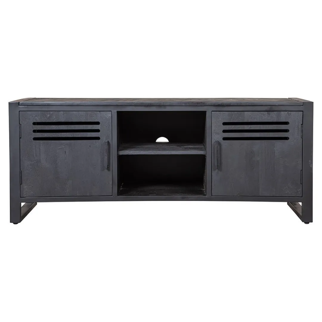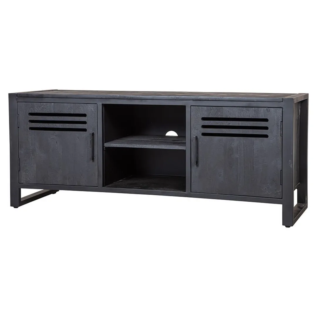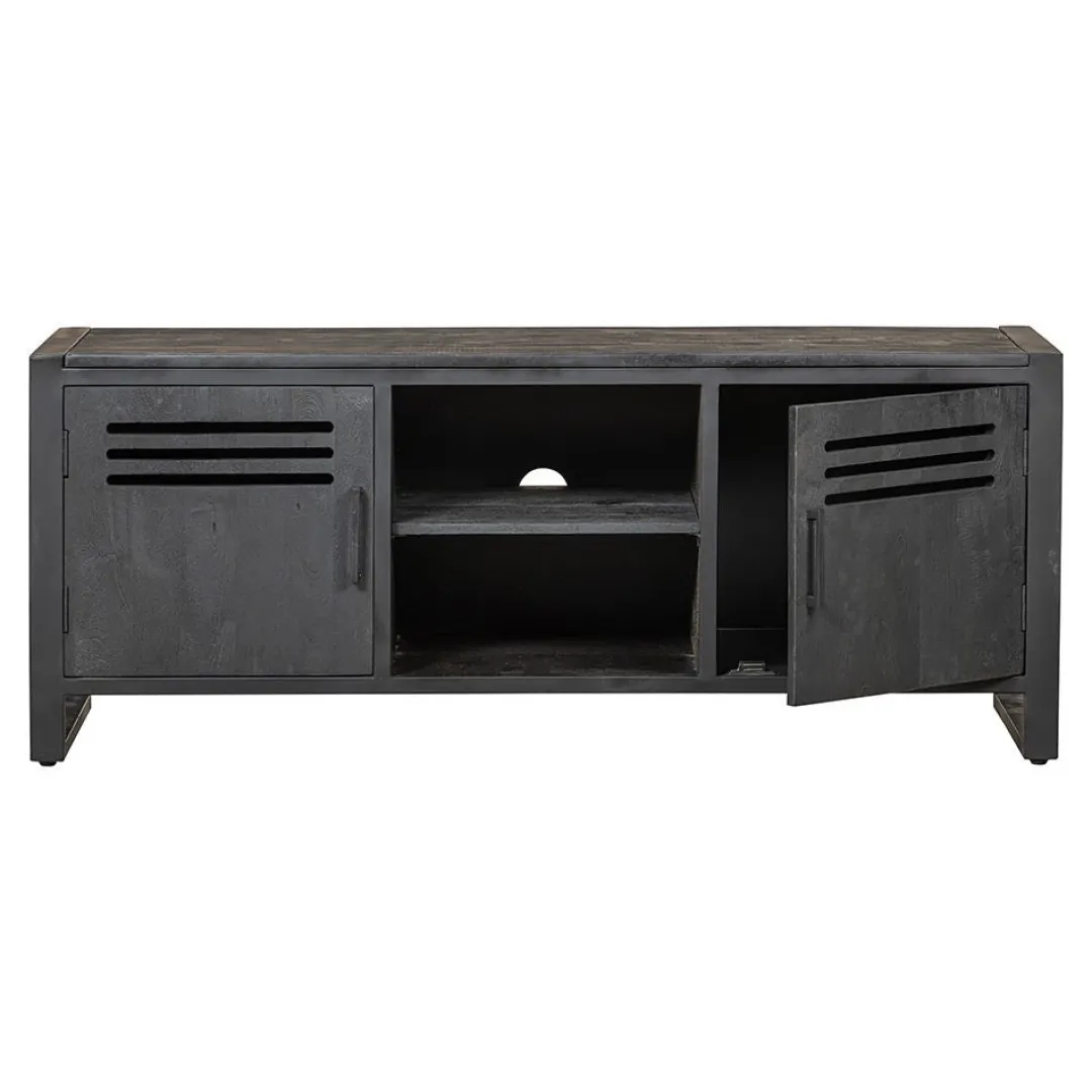 TV meubel Henderson, geïnspireerd op de welbekende lockerkasten van vroeger, is door de combinatie van zwart mangohout en de stalen details een stoere en robuuste toevoeging aan je woonkamer. Achter de deurtjes en op de planken is genoeg ruimte aanwezig om van alles in op te kunnen bergen.