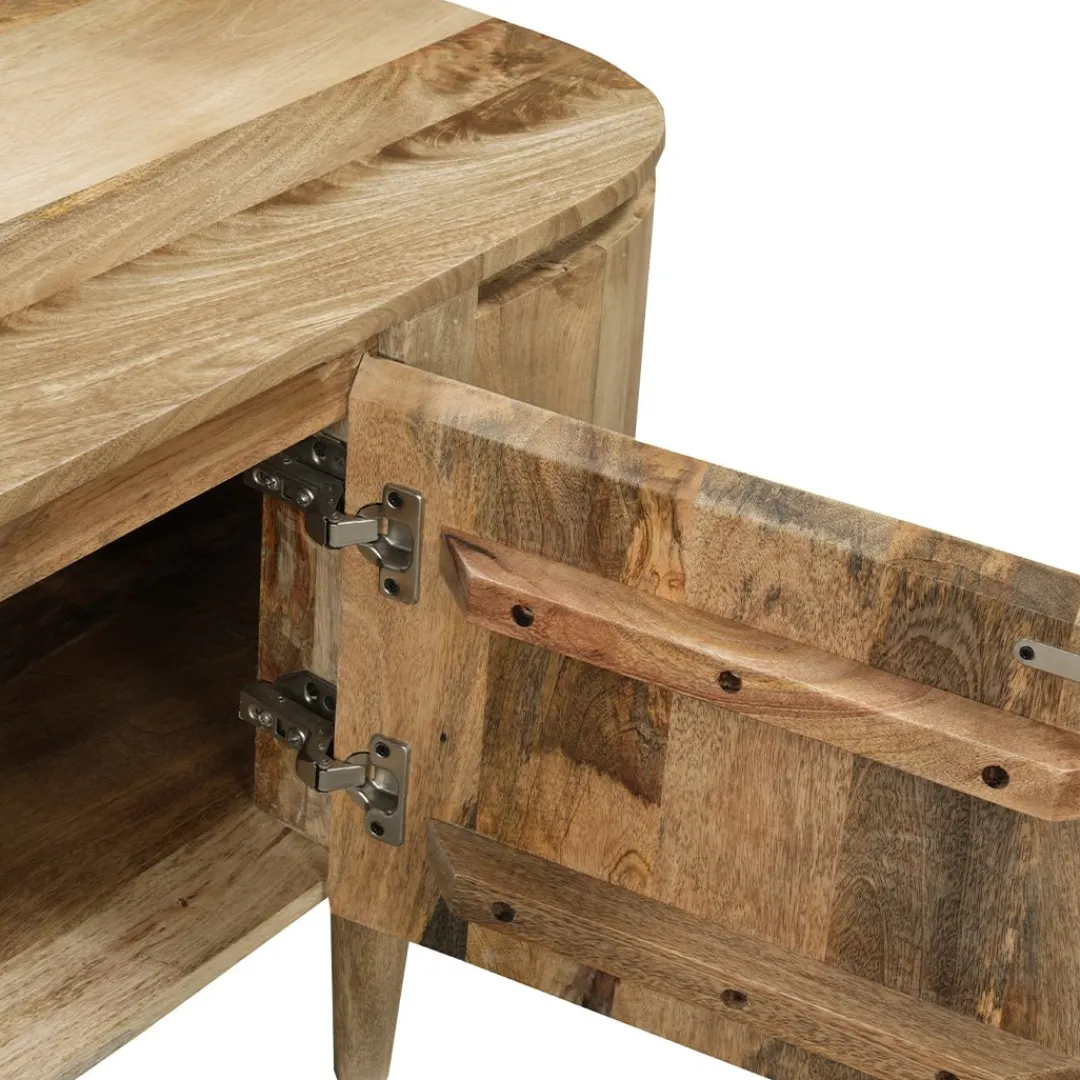 Het tv meubel is gemaakt van mangohout waarbij de natuurlijke houtstructuur duidelijk zichtbaar blijft. Dit geeft het meubel een levendig karakter en een warme uitstraling in je woonkamer.