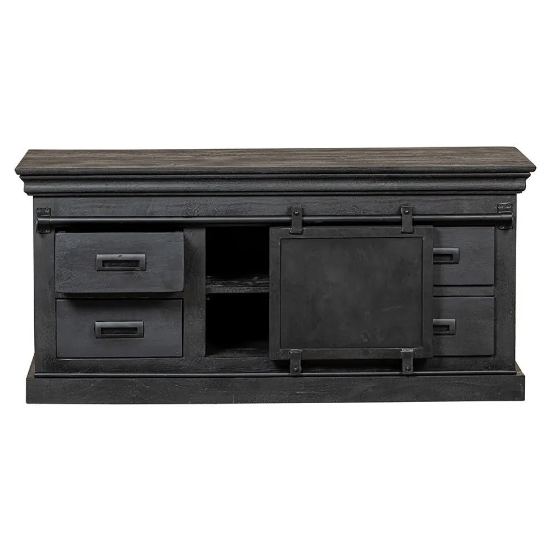 Het mangohout is massief en is eerst gezandstraald, waarna het behandeld wordt met zwarte verfbeits en tenslotte wordt afgewerkt met een donkere, natuurlijke bijenwas om het hout te beschermen tegen vocht, vuiligheid en kringen. De schuifdeur, de rails en de handgrepen zijn gemaakt van zwart gepoedercoat metaal.