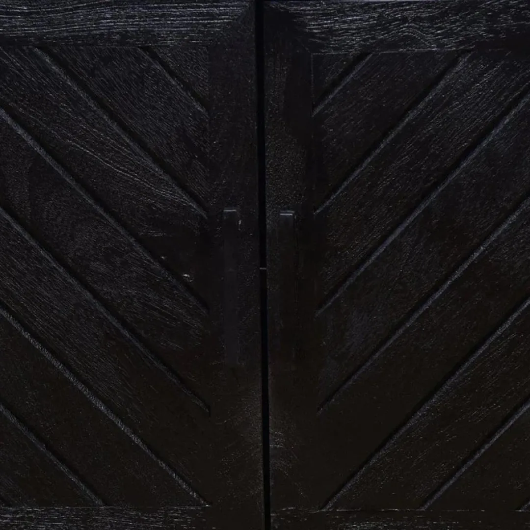 Het mangohout is massief en is eerst gezandstraald, waarna het behandeld wordt met zwarte verfbeits en tenslotte wordt afgewerkt met een donkere, natuurlijke bijenwas om het hout te beschermen tegen vocht, vuiligheid en kringen. De handgrepen en het frame zijn gemaakt van zwart gepoedercoat metaal.