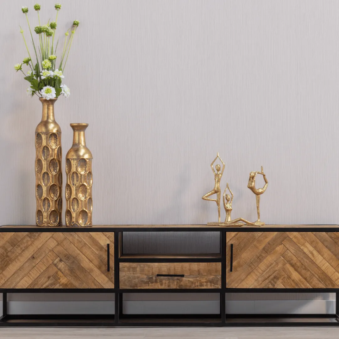 TV meubel Toronto is voor iedereen een ware must-have. Door het eigentijdse visgraatmotief zal het meubel in ieder interieur de show stelen. Het meubel heeft door zijn lengte genoeg ruimte voor een televisie en eventuele decoratie. Daarnaast is er achter de deurtjes en in het laadje genoeg opbergruimte voor bijvoorbeeld electronica of boeken.
