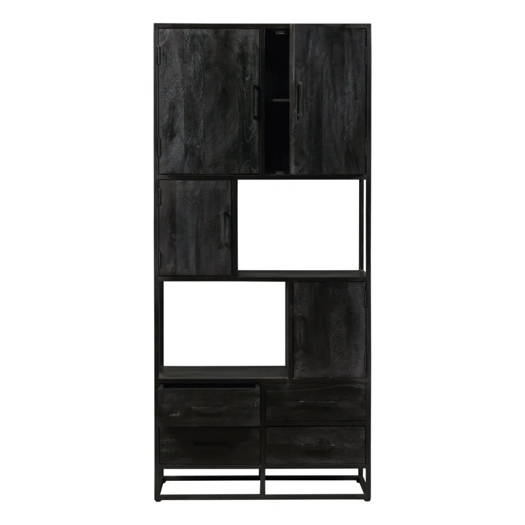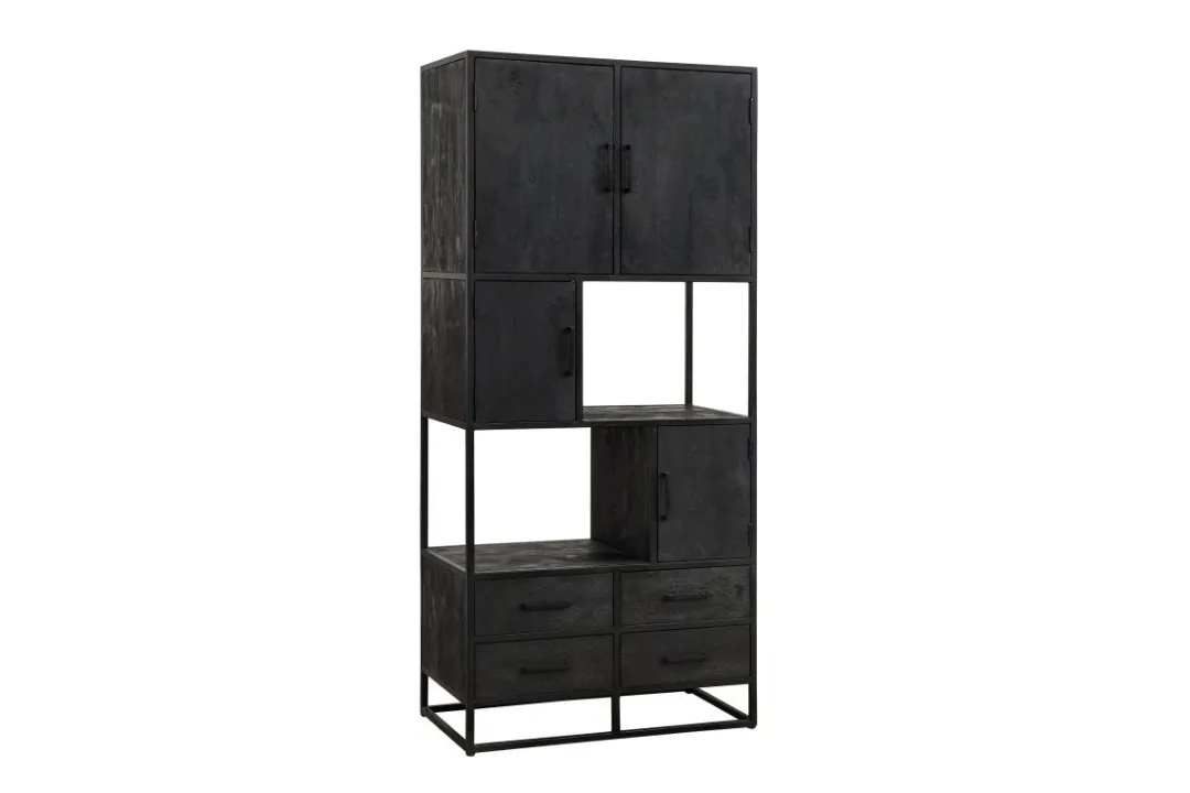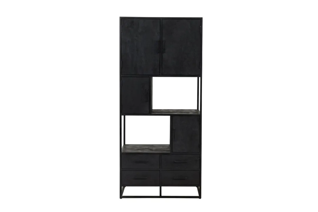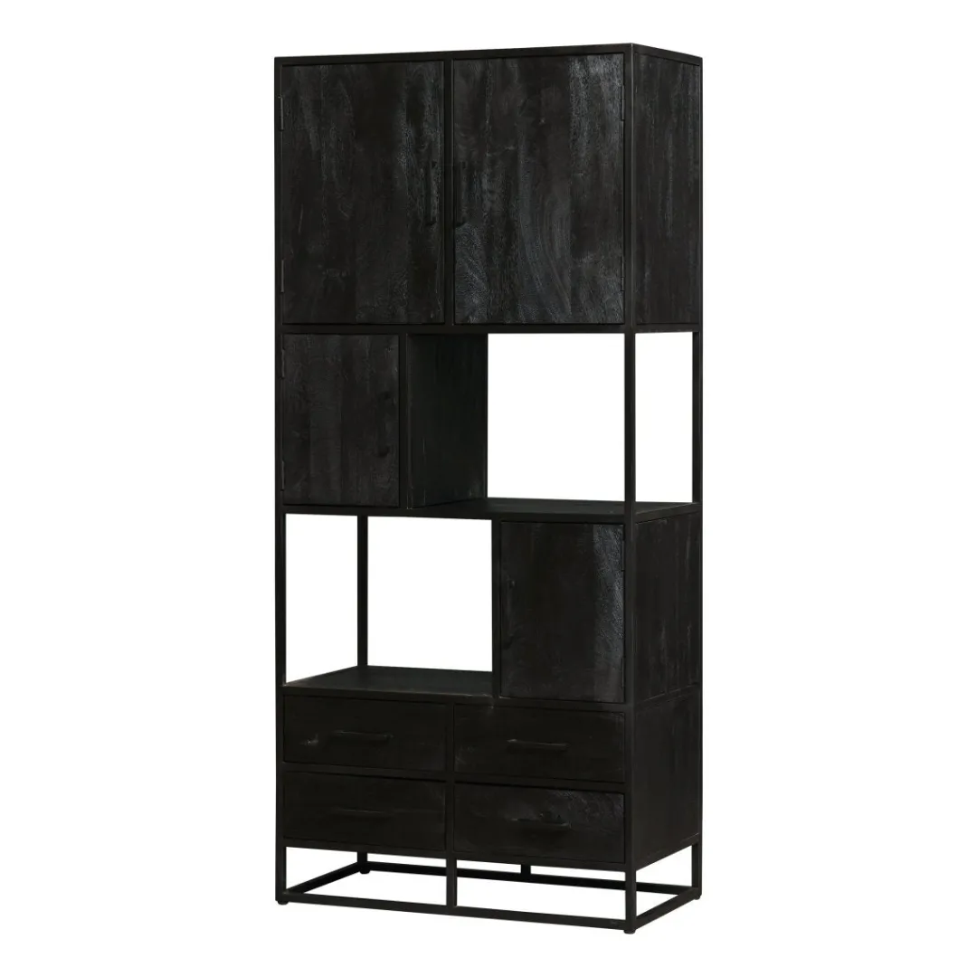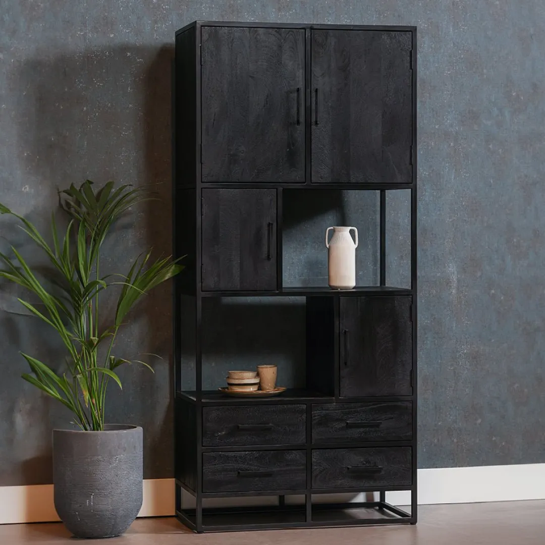 Speels en stijlvol met een fantastische uitstraling! De smalle vakkenkast Florence barst van de mogelijkheden. Het unieke design van de kast is gecombineerd met een chique combinatie van zwart mangohout en metaal, wat het meubel perfect laat passen in een industrieel interieur. Met zijn vier kastjes, twee open vakken en vier lades kan je van alles in de kast opbergen.