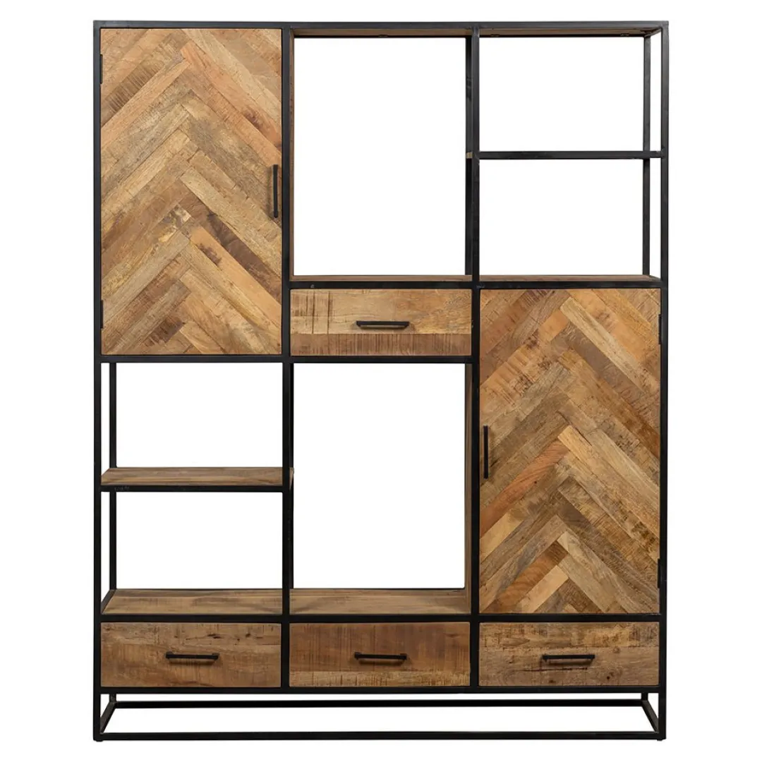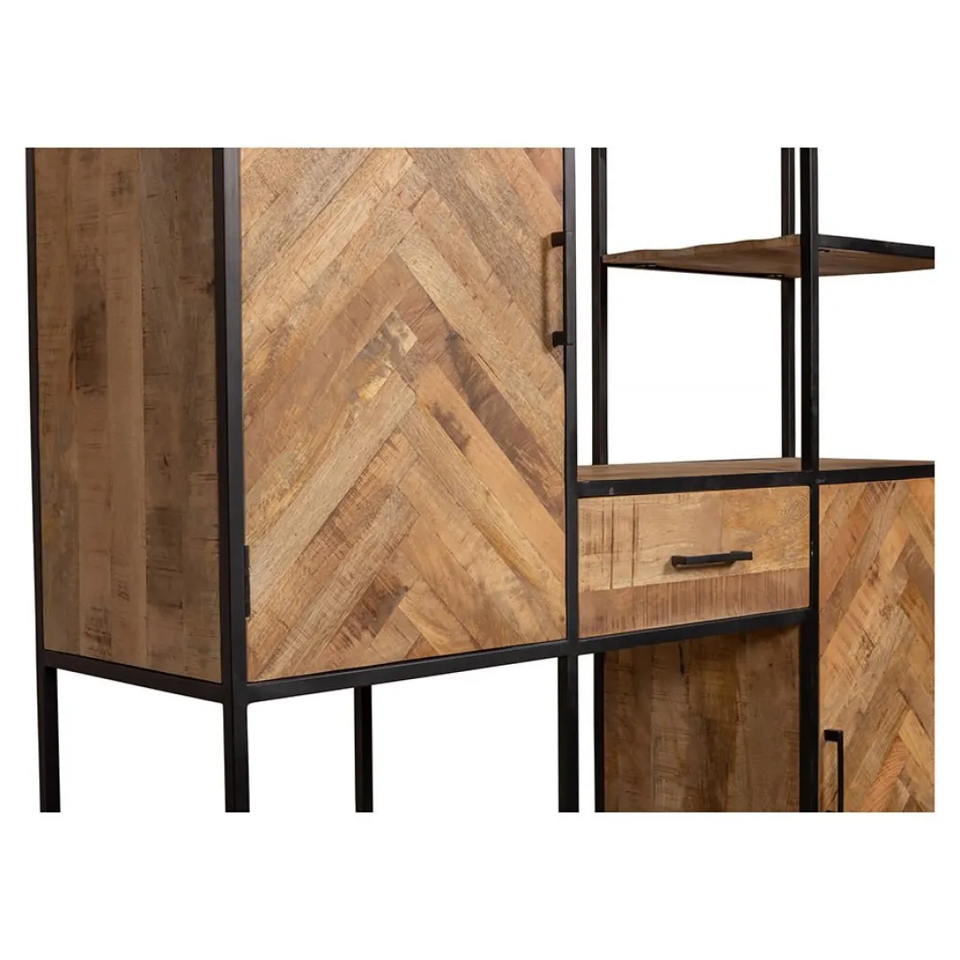 Deze veelzijdige vakkenkast New Haven XXL heeft onwijs veel opberg- en decoratiemogelijkheden. Door de twee grote deurtjes en de vier lades, kun je veel spullen opbergen welke niet in het zicht hoeven te staan. Daarnaast dienen de open vakken perfect als ruimte voor decoraties. Door de combinatie van het visgraat motief met het warme mangohout heeft deze kast een stoere en toch chique uitstraling.