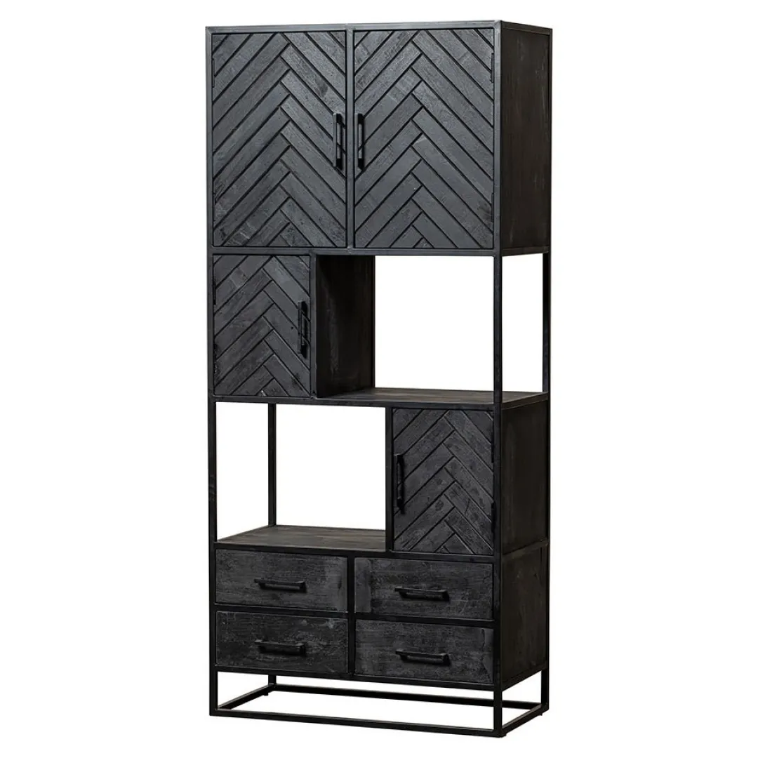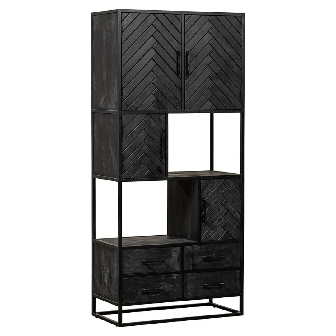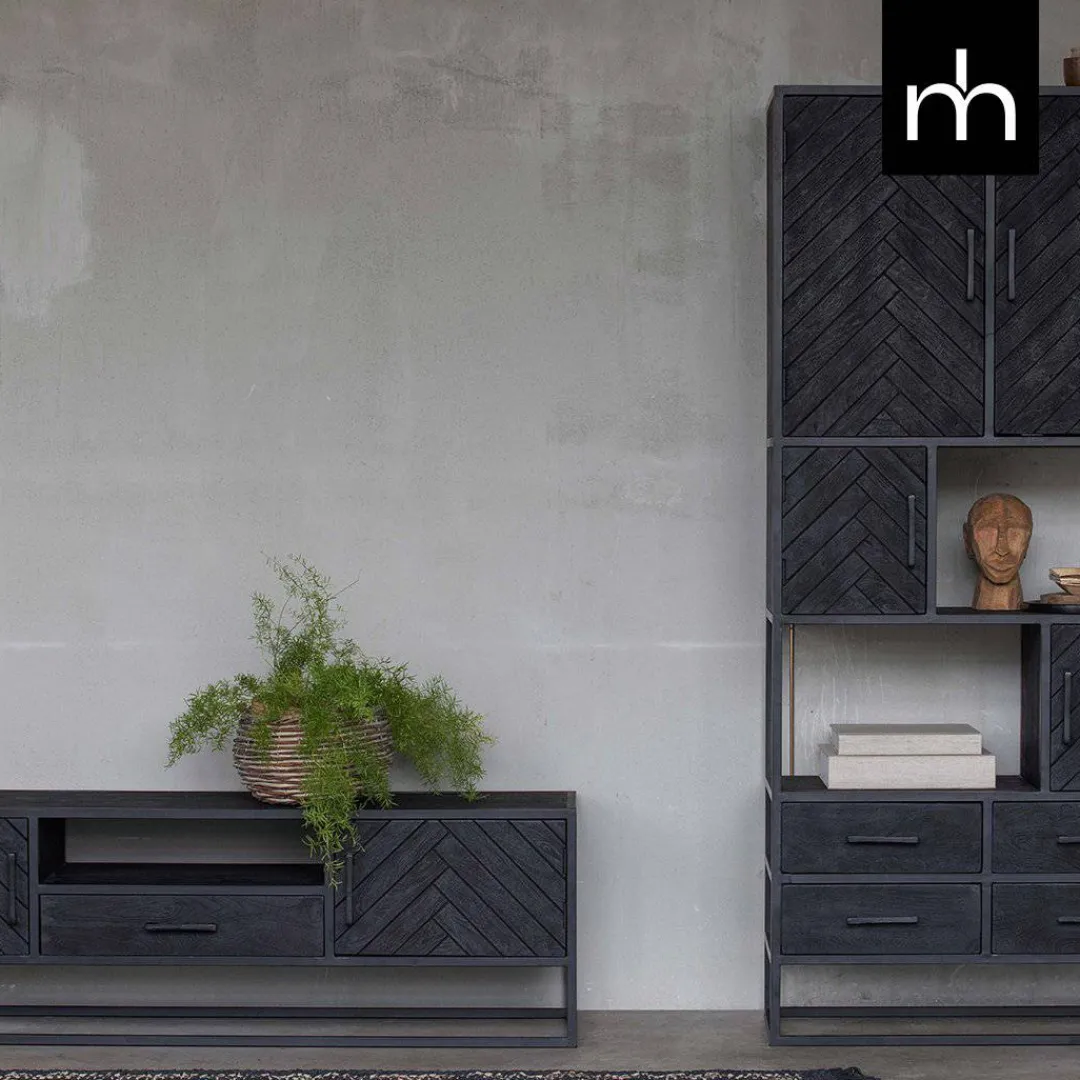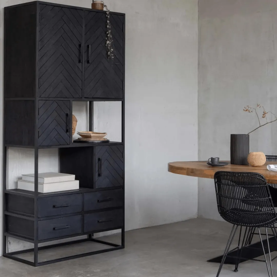 Deze zwarte, mangohouten vakkenkast is een lust voor het oog. De kast beschikt over voldoende opbergmogelijkheden in de open vakken, lades, deuren en om de kast te decoreren met stijlvolle accessoires, zoals bijvoorbeeld foto’s of een bloemstuk. Het stijlvolle visgraatmotief van de deurtjes zorgt voor een unieke look in je woonkamer.