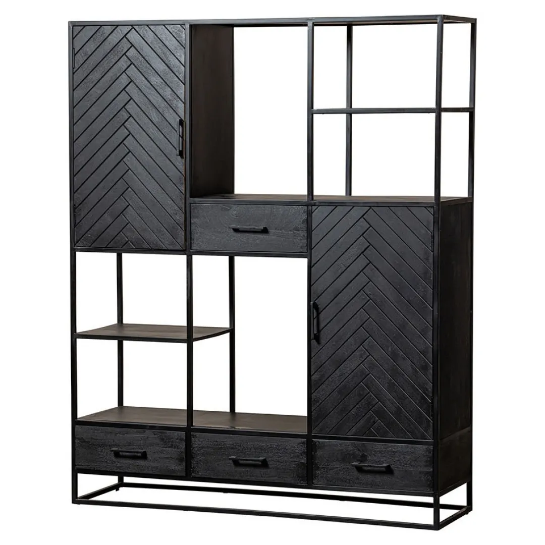 Deze mangohouten vakkenkast in het zwart is een lust voor het oog. Hij biedt voldoende opbergmogelijkheden met open vakken, lades en deuren en om de kast te decoreren met stijlvolle accessoires. De kast beschikt over vier deuren met stijlvol visgraatmotief, vier lades en twee ruime open vakken met twee planken om allerlei spullen in op te bergen.