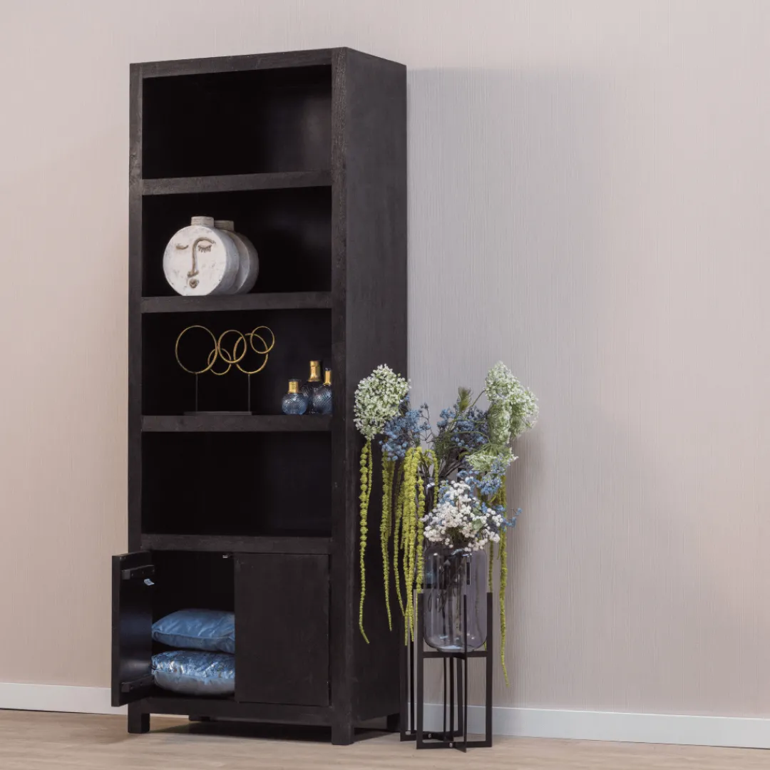 Met een solide constructie en zorgvuldig vakmanschap biedt deze wandkast langdurige kwaliteit. Dankzij de ruime legplanken en kastdeuren is er voldoende opbergruimte om je waardevolle spullen, boeken, decoratieve items en persoonlijke bezittingen netjes te organiseren en tentoon te stellen. De open vakken maken het eenvoudig om je favoriete items te presenteren en een persoonlijk tintje aan jouw interieur toe te voegen.