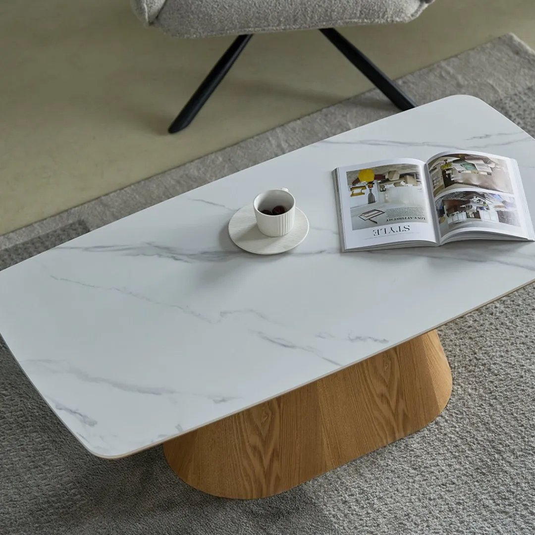 Salontafel Santiago combineert een moderne uitstraling met natuurlijke warmte. Het blad is uitgevoerd in naturel woodvineer en afgewerkt met een verfijnde laag wit marmer. Deze stijlvolle combinatie maakt de tafel tot een echte blikvanger in je interieur.
